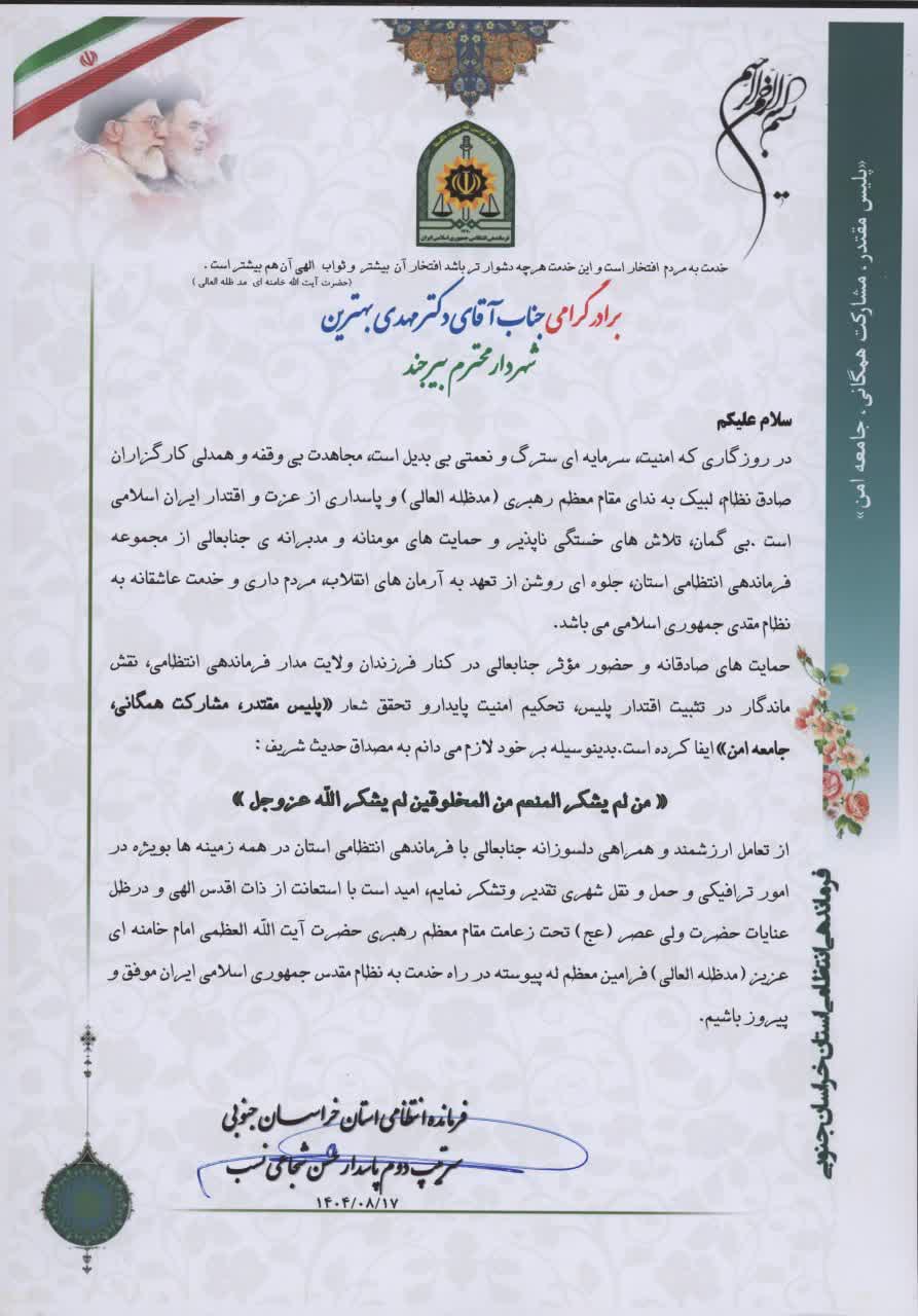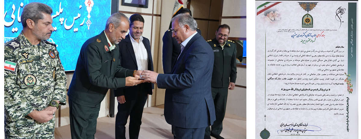 در جلسه تکریم و معارفه رئیس پلیس راهور خراسان جنوبی، فرمانده انتظامی استان با اهدای لوح تقدیر به شهردار بیرجند، از تعامل سازنده شهرداری با مجموعه انتظامی و اقدامات مؤثر در حوزه ترافیک و حملونقل شهری قدردانی کرد.