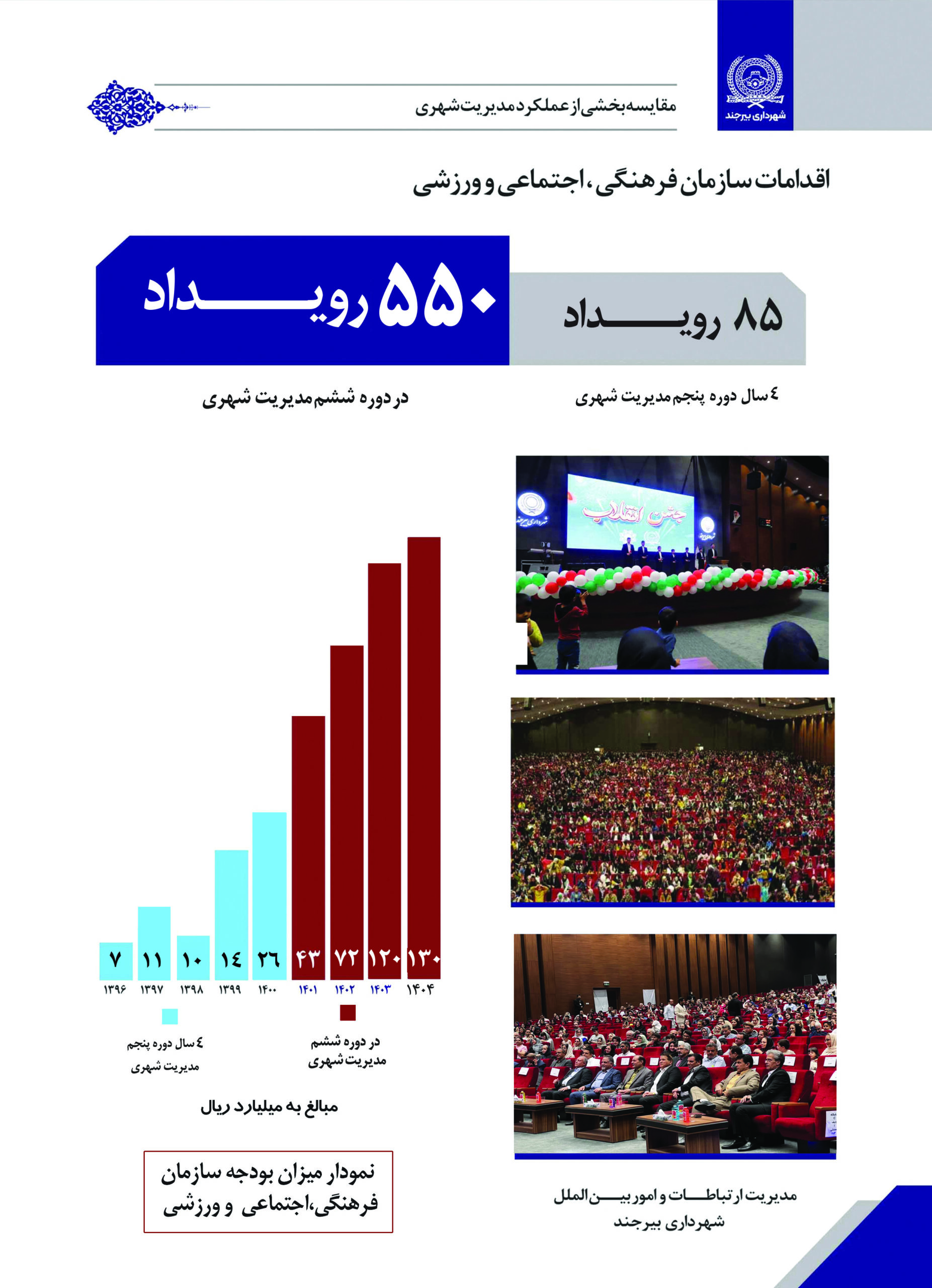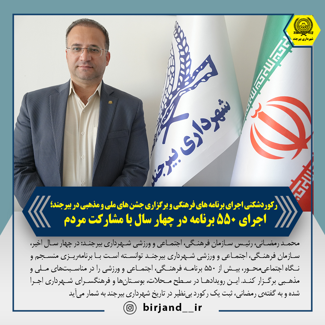 در چهار سال اخیر، سازمان فرهنگی، اجتماعی و ورزشی شهرداری بیرجند توانسته است با برنامه‌ریزی منسجم و نگاه اجتماعی‌محور، بیش از ۵۵۰ برنامه فرهنگی، اجتماعی و ورزشی را در مناسبت‌های ملی و مذهبی برگزار کند. این رویدادها در سطح محلات، بوستان‌ها و فرهنگسرای شهرداری اجرا شده و به گفته‌ی رمضانی، ثبت یک رکورد بی‌نظیر در تاریخ شهرداری بیرجند به شمار می‌آید.