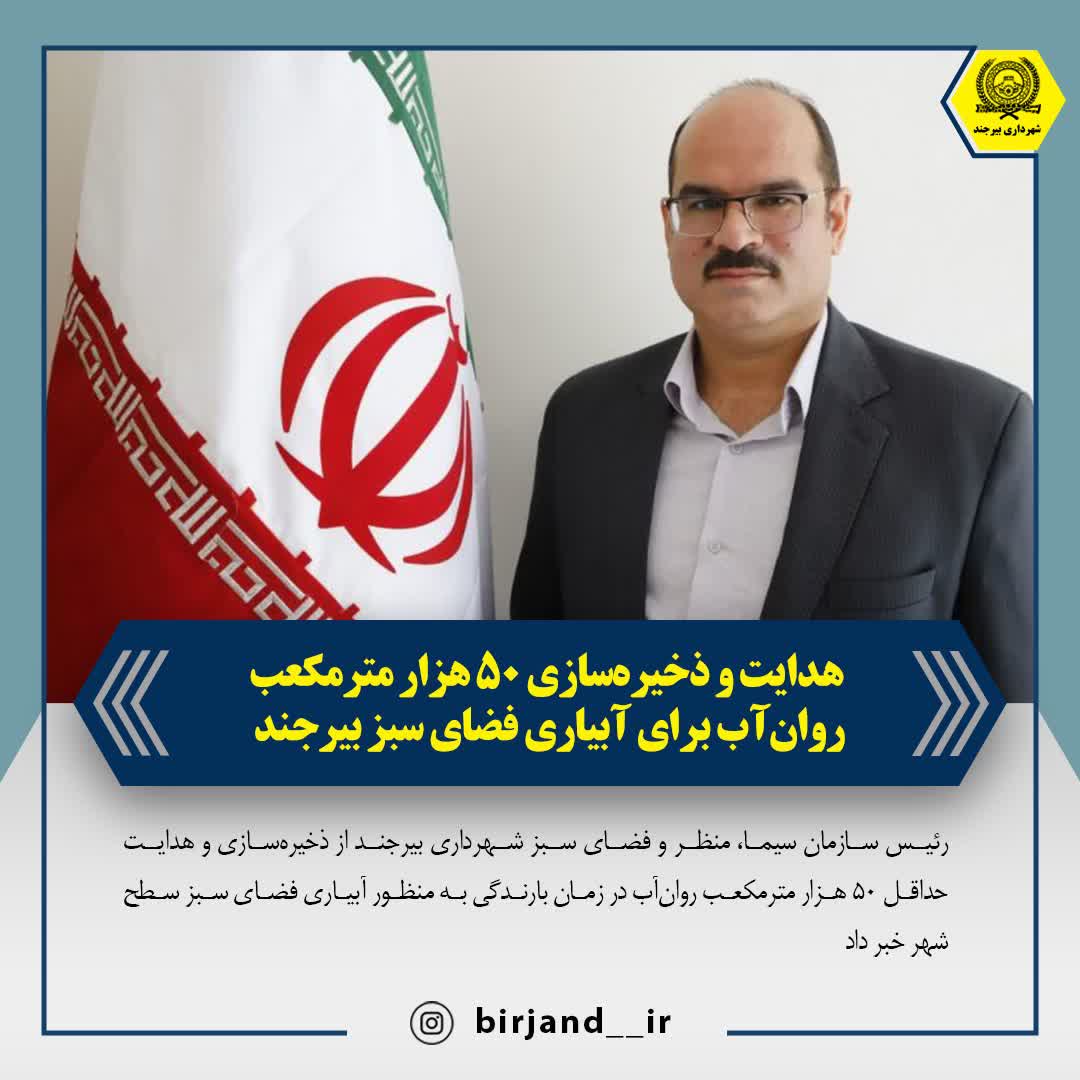 رئیس سازمان سیما، منظر و فضای سبز شهرداری بیرجند از ذخیرهسازی و هدایت حداقل ۵۰ هزار مترمکعب روانآب در زمان بارندگی به منظور آبیاری فضای سبز سطح شهر خبر داد.